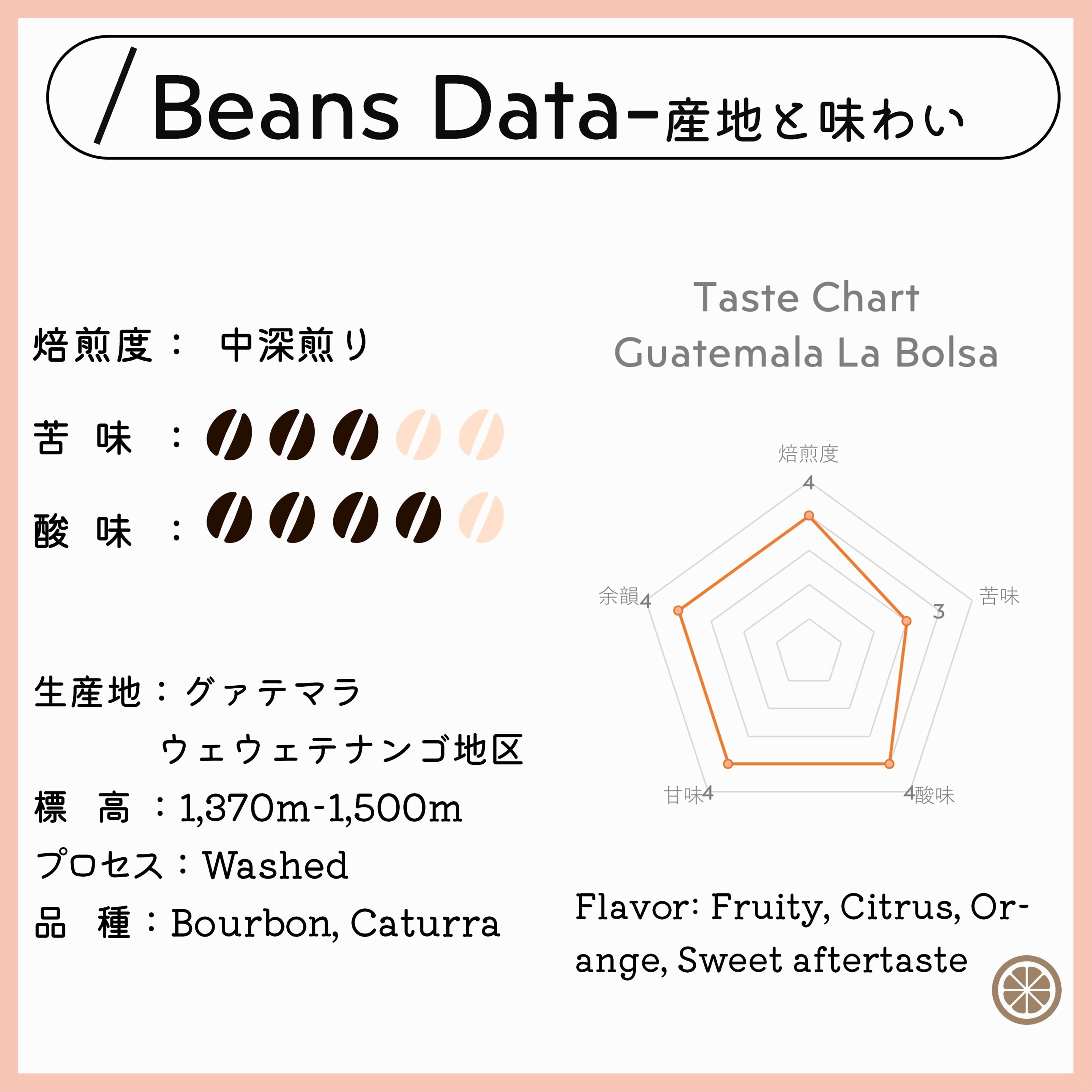 オレンジのようなフルーティな甘味と酸味が楽しめるコーヒー豆です。