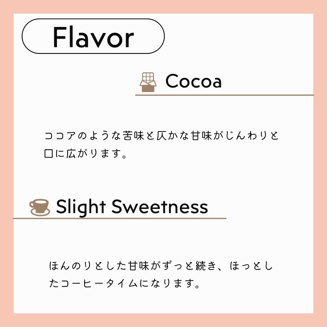 Flavor:Cacao, Cocoa, Slight Sweetness, Smooth Mouse feel